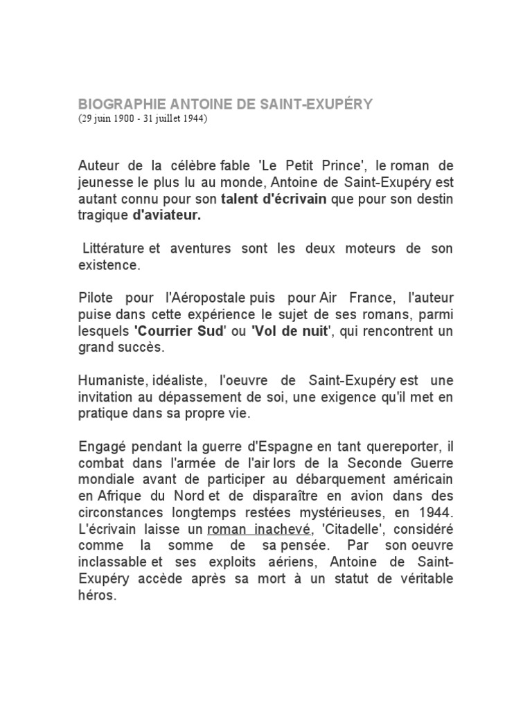Biographie Antoine De Saint Exupery